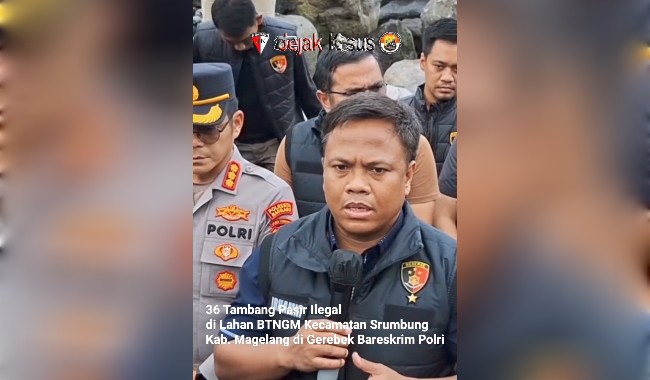 Bareskrim Polri bersama tim gabungan dari Dinas Energi dan Sumber Daya Mineral (ESDM) Provinsi Jawa Tengah, BTNGM dan Polresta Magelang. Lokasi penggerebekan ini berada di alur Sungai Batang, Desa Ngablak, Kecamatan Srumbung, Kabupaten Magelang atau lereng Gunung Merapi.
