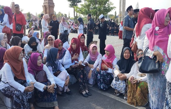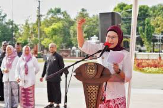 Terlihat kompak Para ASN itu mengenakan Baju Adat Indramayu untuk laki-laki berupa baju koko dan celana warna hitam, sedangkan wanita mengenakan baju kebaya atasan warna putih sementara kerudung dan bawahan beraneka warna dan. motif.