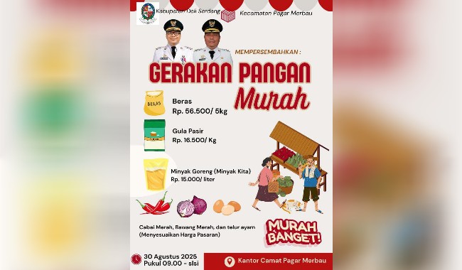 Sandang dan pangan dalam kehidupan sehari-hari tidak pernah terelakan , kehidupan merupakan sumber dari segalanya maka dari itu warga Deli Serdang khususnya warga masyarakat kecamatan Pagar Merbau menyambut positive adanya Pasar Pangan Murah Banget yang di galakan oleh Bupati dan Wakil Bupati tercinta dr.H.Asri Ludin Tambunan – LomLom Suwondo S.Sos di kantor Camat Pagar Merbau Sabtu tanggal 30 Agustus 2025 dimulai pukul 09.00 wib – sampai dengan selesai.