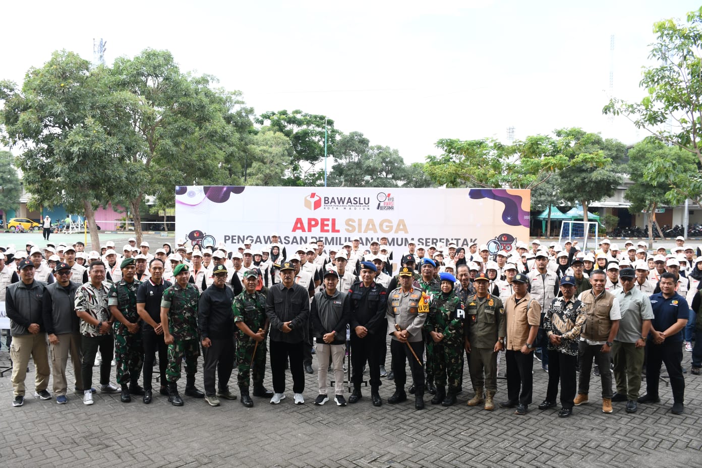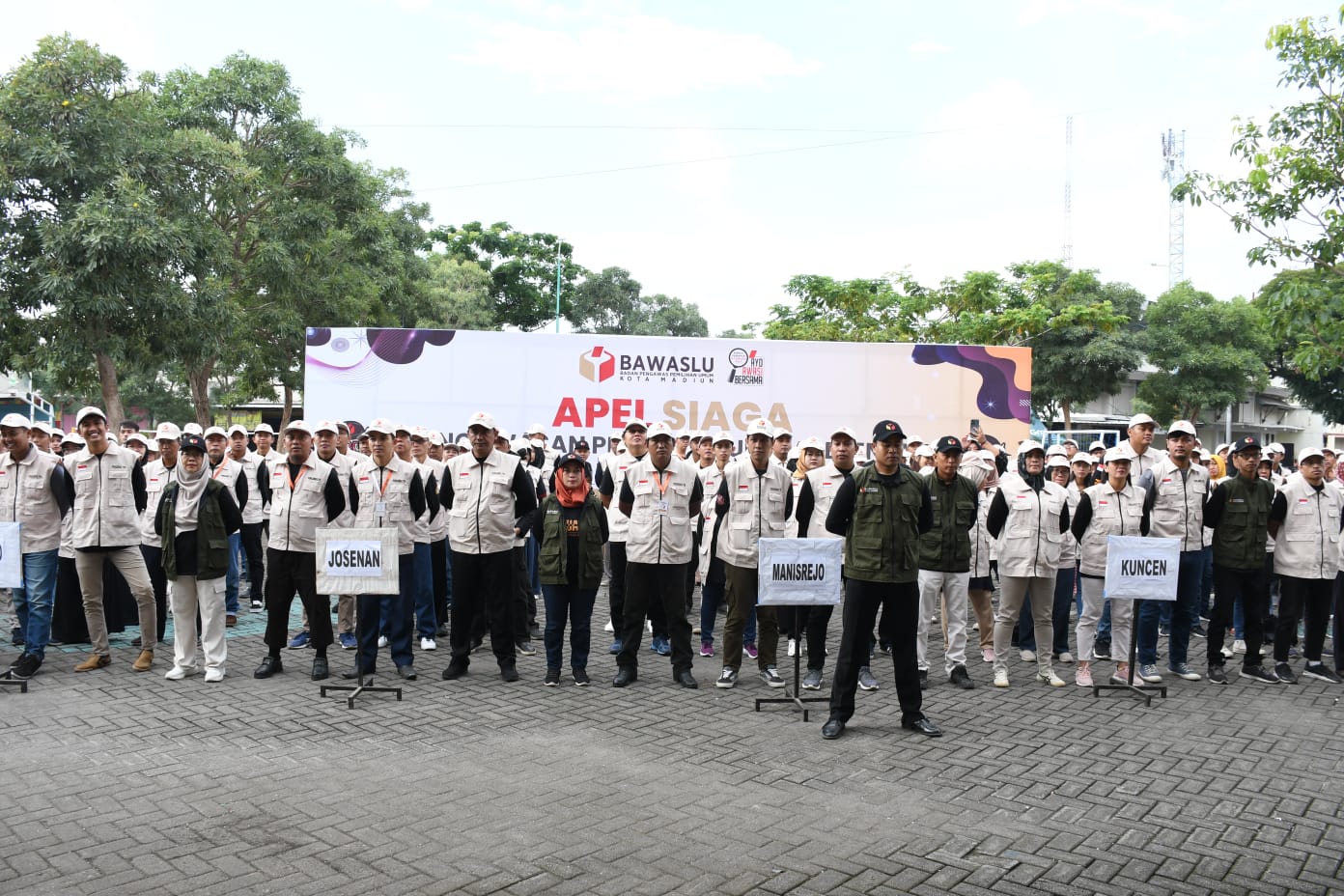 Apel yang digelar di halaman Gor Wilis Kota Madiun tersebut dipimpin oleh Ketua Bawaslu Kota Madiun Wahyu Sesar Tri Sulistyo Nugroho.