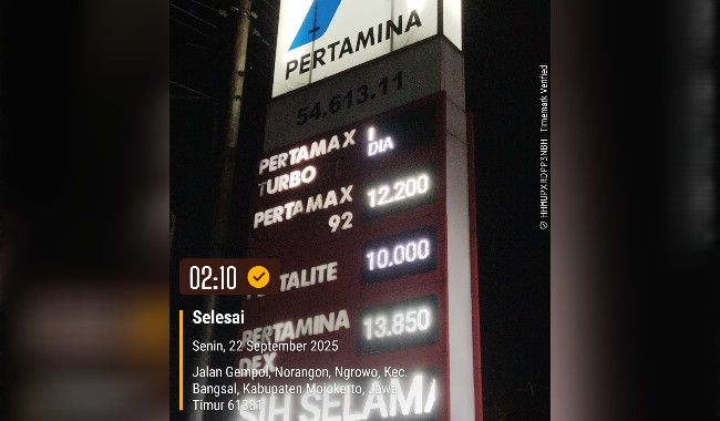 Bahwa, Bertempat di sebuah Stasiun Pengisian Bahan Bakar Umum (SPBU) Pertamina 54.613. 11 Jln. Raya Pendowo No.429, Ngranggon, Ngrowo, Kecamatan Bangsal, Kabupaten Mojokerto, Jawa Timur, ditemukan Media dan Supriyanto (ilyas) Ketua Umum Lembaga Suwadaya Masyarakat (LSM) Generasi Muda Indonesia Cerdas Anti Korupsi (GMICAK), diduga melakukan penyimpangan bahan bakar minyak (BBM) jenis Solar dan Pertalite. Senin 22 September 2025. Pukul 01.24 Wib