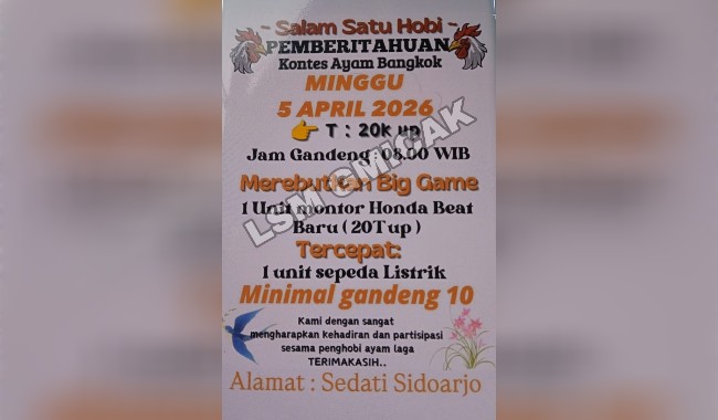 LSM Gmicak juga mendapatkan laporan informasi terdapat peneritauan Kontes Ayam bangkok, yang akan di gelar pada hari minggu 5 April 2026 T : 20k up Jam Gandeng : 08. Wib. Kemarin