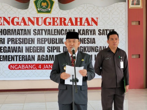 LANDAK I Jejakkasustv.com – Pj. Bupati Landak Samuel, SE., M.Si menghadiri apel penganugrahan Tanda Kehormatan Satyalencana Karya Satya dari Presiden Republik Indonesia kepada 44 Aparatur Sipil Negara di lingkungan Kantor Kementerian Agama Kabupaten Landak Kalimantan Barat, Kamis (04/01/2024).
