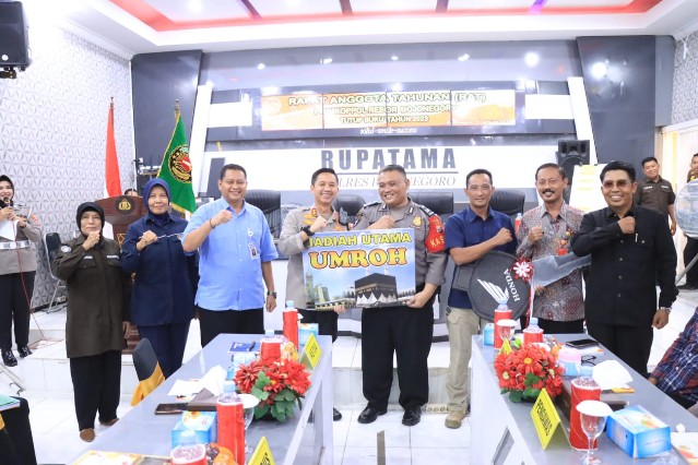 Disela-sela RAT, Kapolres Bojonegoro menyerahkan hadiah utama yaitu Umroh kepada Aiptu Wahyu anggota SPKT Polres Bojonegoro.