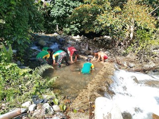 “Selama ini warga bergantung air bersih pada sungai ini dan dialirkan menggunakan pipa dan mesin pompa air, sehingga apabila tidak mengalir mereka harus mengambil air dengan jarak yang cukup jauh,’ lanjutnya.